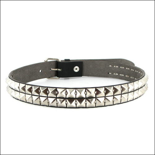 Super durable quality studded belts. Made from a thick version of our Vegetan Micro-fibre. Pliable and leather-like and super tough this material has a smoother finish to our usual Micro material. Approx 3mm thick. Twin row of silver-finish metal pyramid studs. Sturdy nickel roller buckle is secured with a press stud so you can easily change for your own favourite buckle! Approx 1.5 inches wide (3.8 cm).